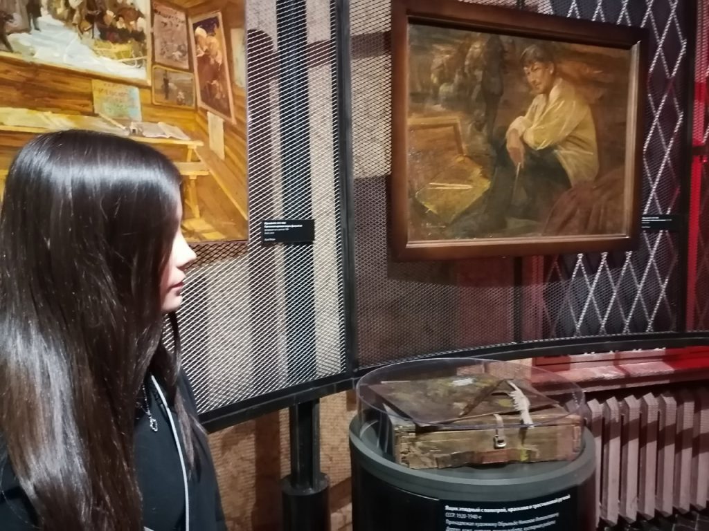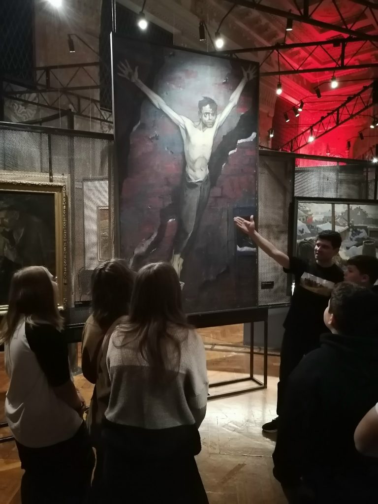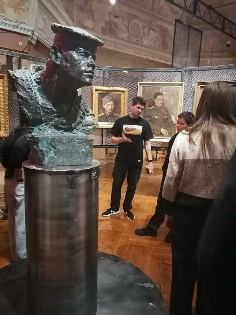 Во время экскурсии гимназисты познакомились с личностями и творчеством художников-фронтовиков и фронтовых художников. На выставке были представлены работы И.П. Цыбульника, В.И. Макеева, А.Г. Шикина, А.Л. Гландина, Б.Ф. Федорова, Н.И. Обрыньбы, А.А. Пластова, М.Г. Богатырева, С.Я. Адливанкина, М.С. Адливанкина, Б. Филипченко, И. Машкова, И. Грабаря, Л.Г. Кривицкого и других авторов.